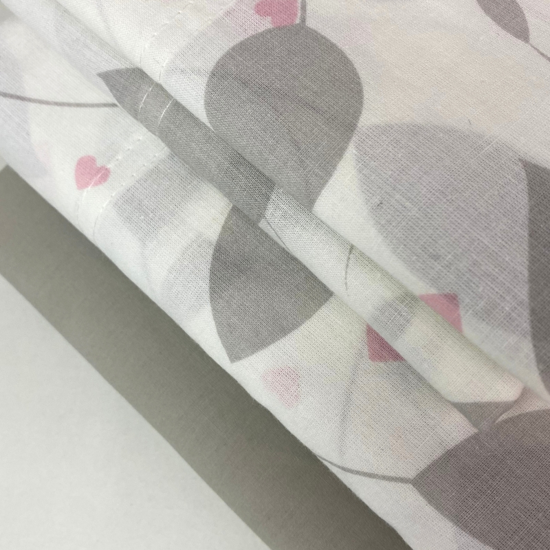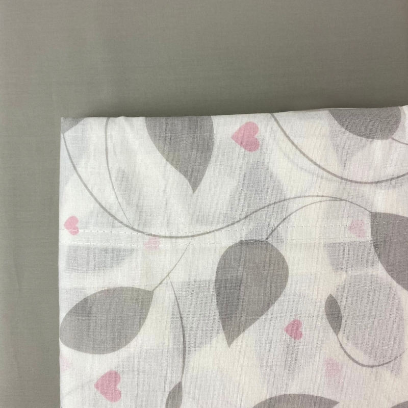Delicado e romântico, o jogo de lençóis “FOLHAS E CORAÇÕES” apresenta folhas suaves em tons de cinza combinadas com pequenos corações cor-de-rosa sobre fundo branco, ideal para quem gosta de um ambiente calmo e acolhedor.