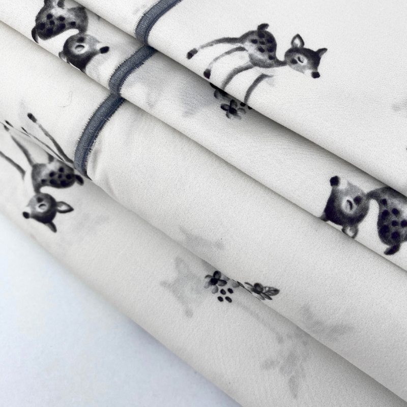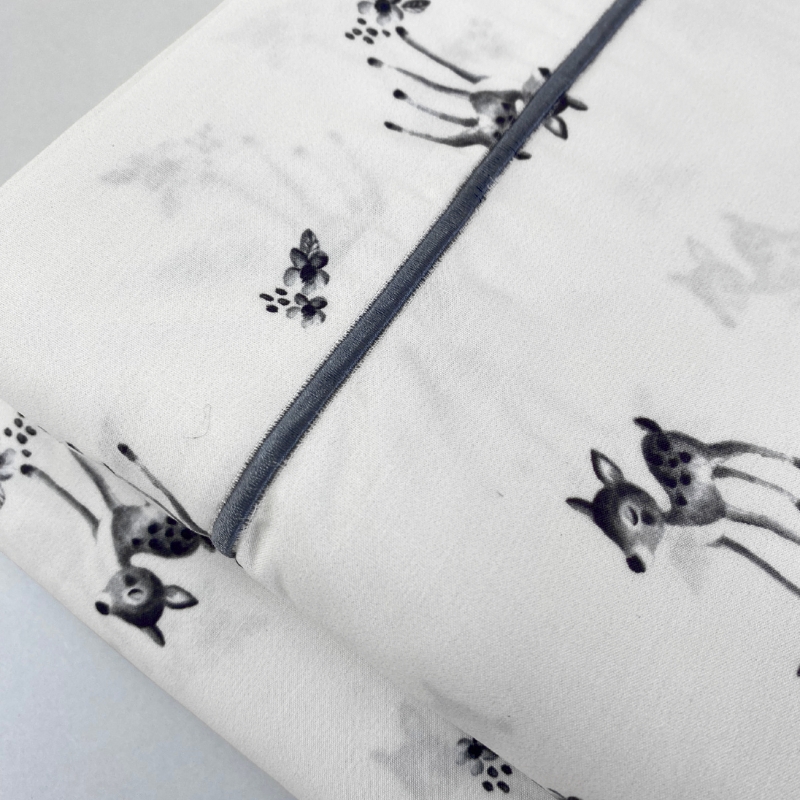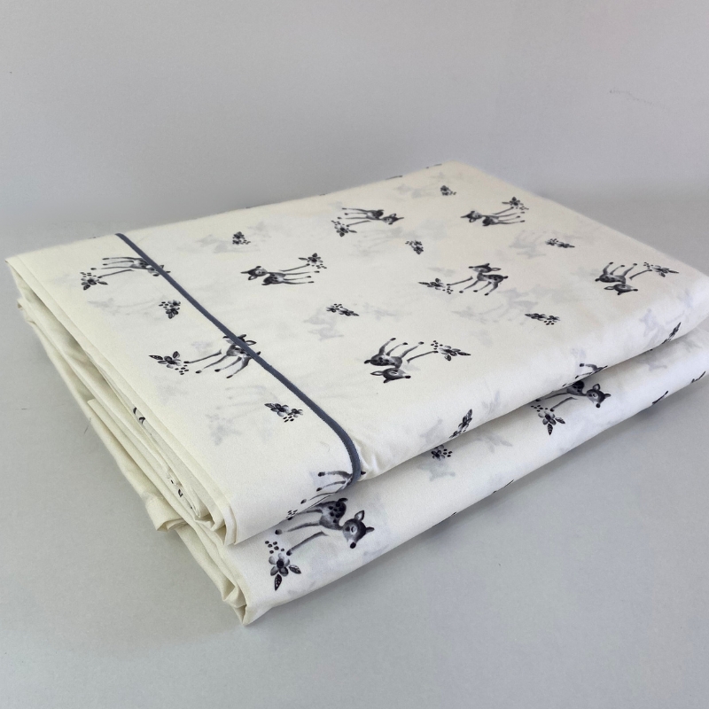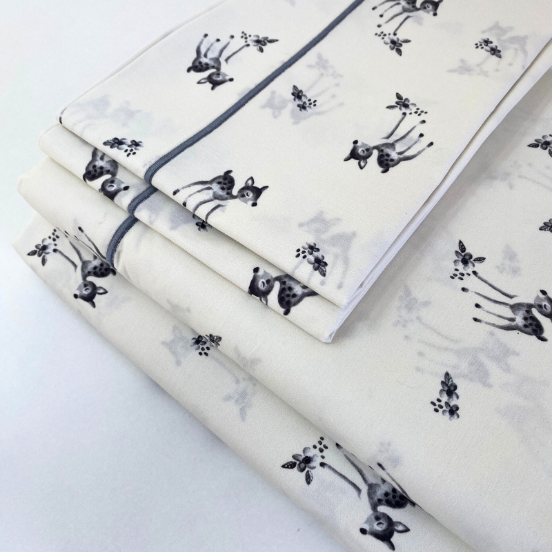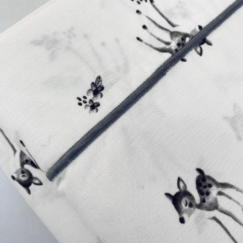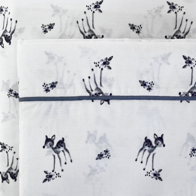 A suavidade do tecido combina com a delicadeza do padrão de pequenos veados, criando uma atmosfera acolhedora e doce no quarto. Produzido em 100% algodão e com tecelagem ultra-apertada confere um toque macio e respirável, ideal para noites tranquilas e confortáveis.
